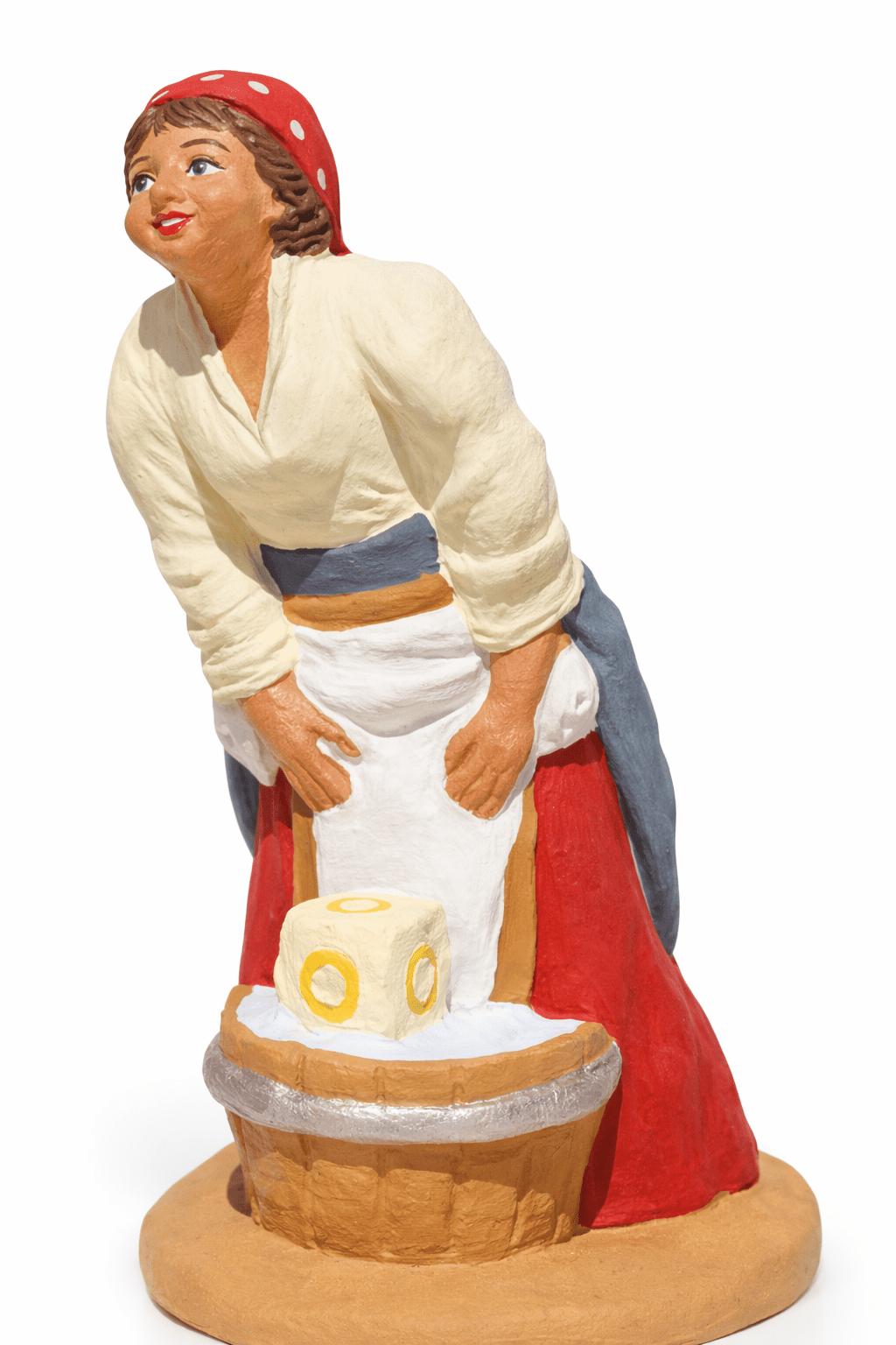 Santon lavandière, figure emblématique de la vie quotidienne en Provence. Figurine traditionnelle peinte à la main, évoquant l’eau, le linge et les gestes patients d’autrefois.
